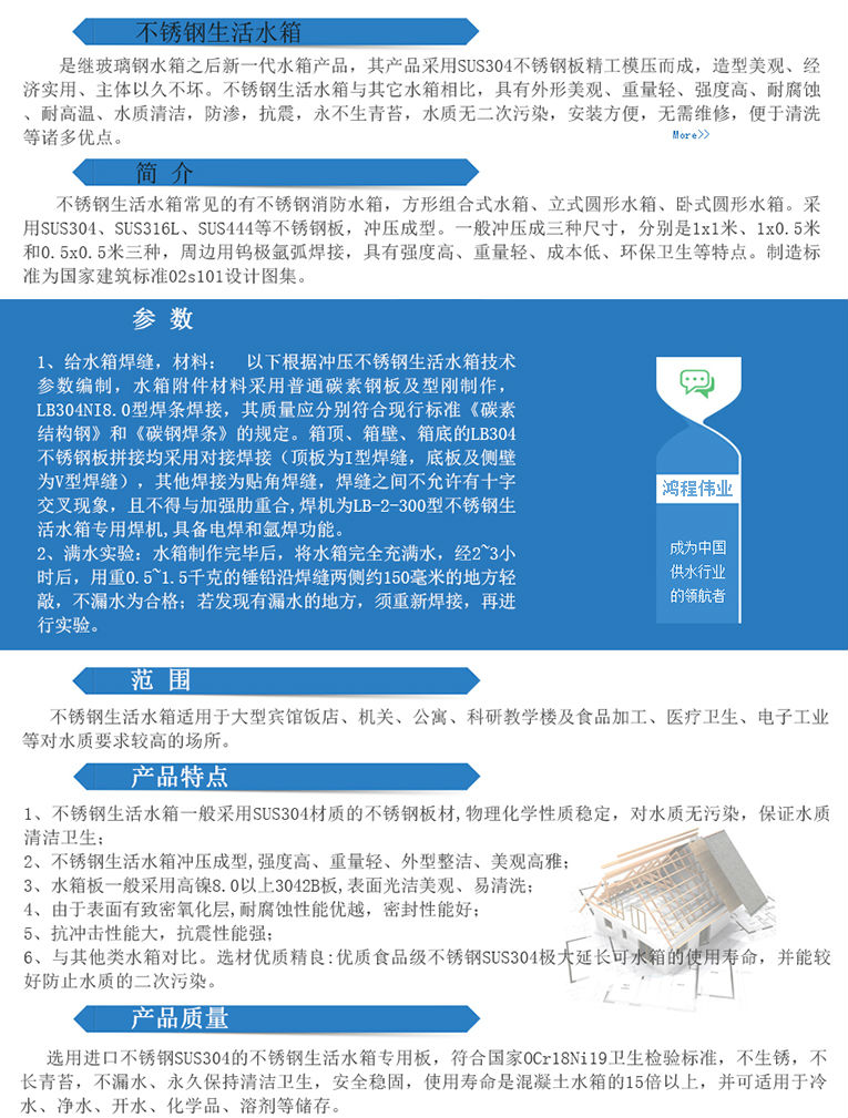 不銹鋼水箱適用于大型賓館飯店、機(jī)關(guān)、公寓、科研教學(xué)樓及食品加工、醫(yī)療衛(wèi)生、電子工業(yè)等對水質(zhì)要求較高的場所。(注:水中氯離子含量高者慎用)